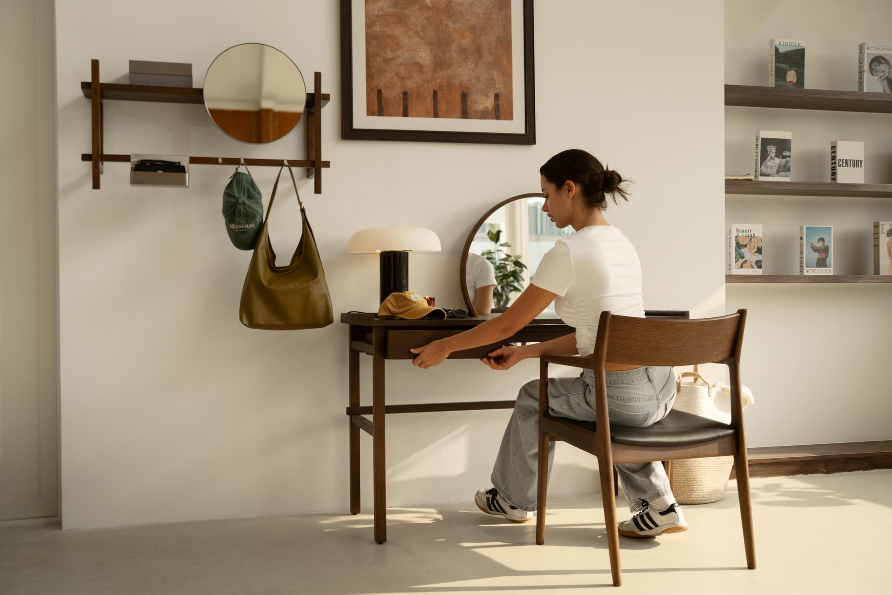 Built with a durable oak frame and engineered wood top featuring oak veneer, this piece includes design that incorporates a versatile tempered glass mirror that can be wall-mounted using detachable metal hooks. Concealed tropical hardwood support rails ensure structural integrity while preserving the design's sleek aesthetic.