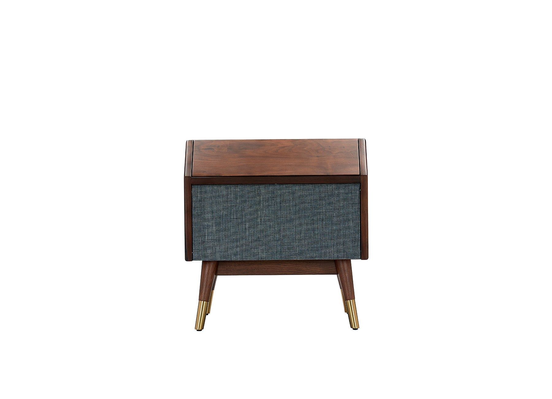 Elevate your bedroom with the Volta Nightstand. Crafted with a solid walnut carcass and plush fabric upholstery, it exudes luxury. The sleek design features matt brass finish metal caps on solid walnut legs, completing the sophisticated and exclusive look.